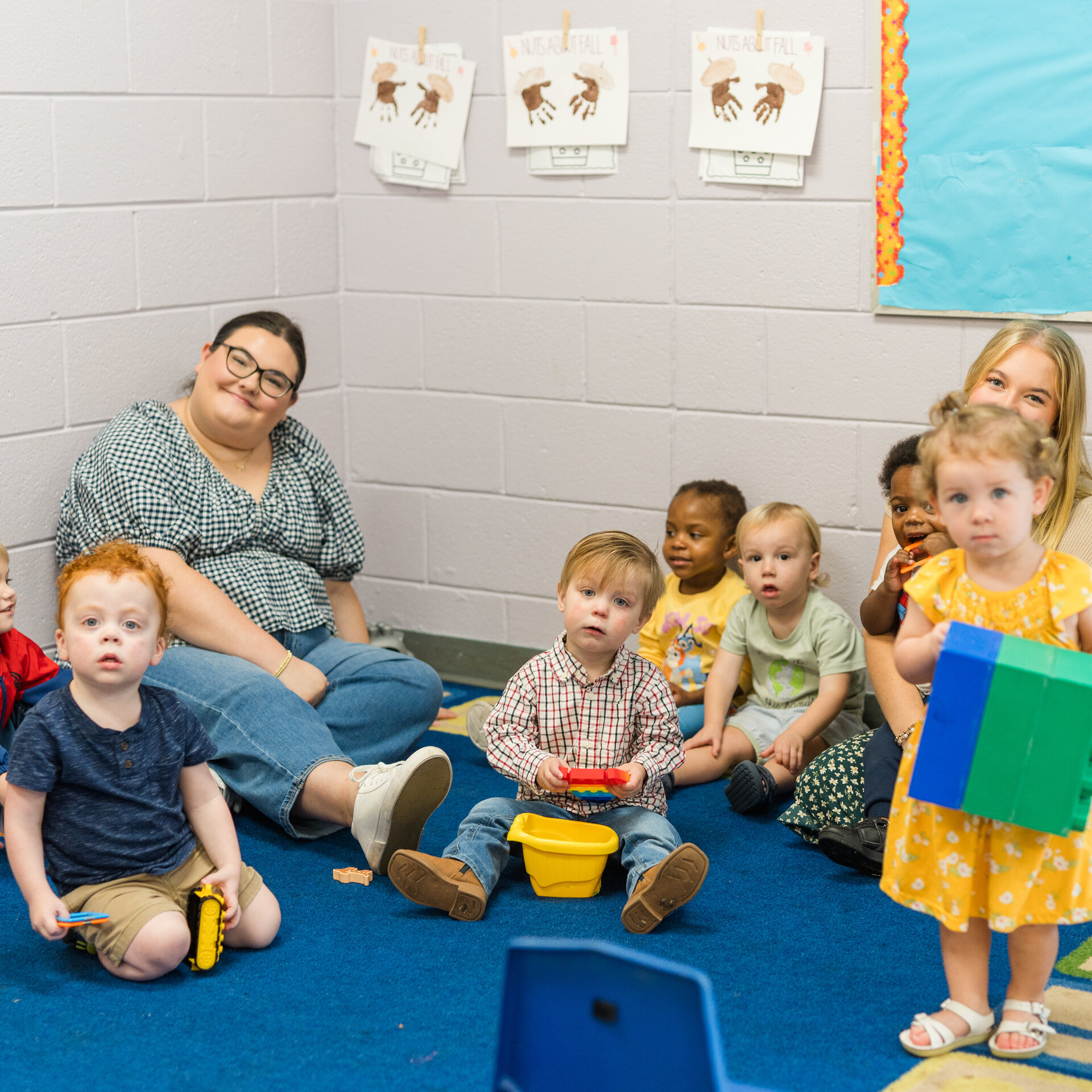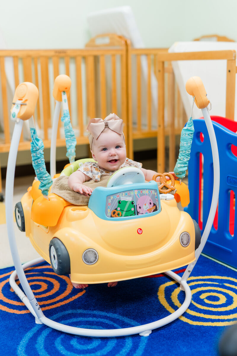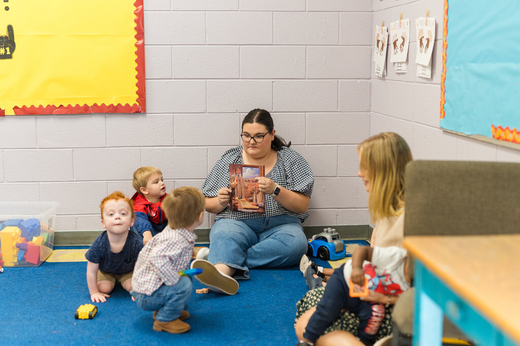 During worship services at 11 a.m. Teaching and Care provided by parent volunteers (Angels in the Nursery) for infants through kindergarten (age five).